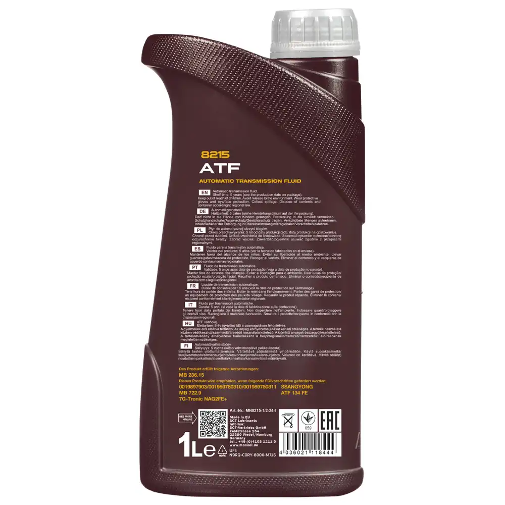 روغن گیربکس مانول 236.15 8215 حجم 1 لیتر با رنگ آبی ساخت برند مانول آلمان یک روانکار سنتتیک با ویسکوزیته پایین و فرمولاسیون ویژه است که برای گیربکسهای اتوماتیک خودروها طراحی شده است. این روغن عملکرد بینقص گیربکس اتوماتیک را تضمین میکند، میزان سایش قطعات را به حداقل میرساند، طول عمر سیستم انتقال قدرت را افزایش میدهد و به بهبود مصرف سوخت کمک میکند. Mannol 236.15 8215 ATF بهطور ویژه بر اساس استاندارد Mercedes-Benz 236.15 توسعه یافته است. درواقع روغن گیربکس مانول 236.15 از محصولات فوقالعاده با تکنولوژی روز دنیا است که برای عملکرد بیعیب و نقص گیربکسهای مدرن اتوماتیک طراحی شده است.
