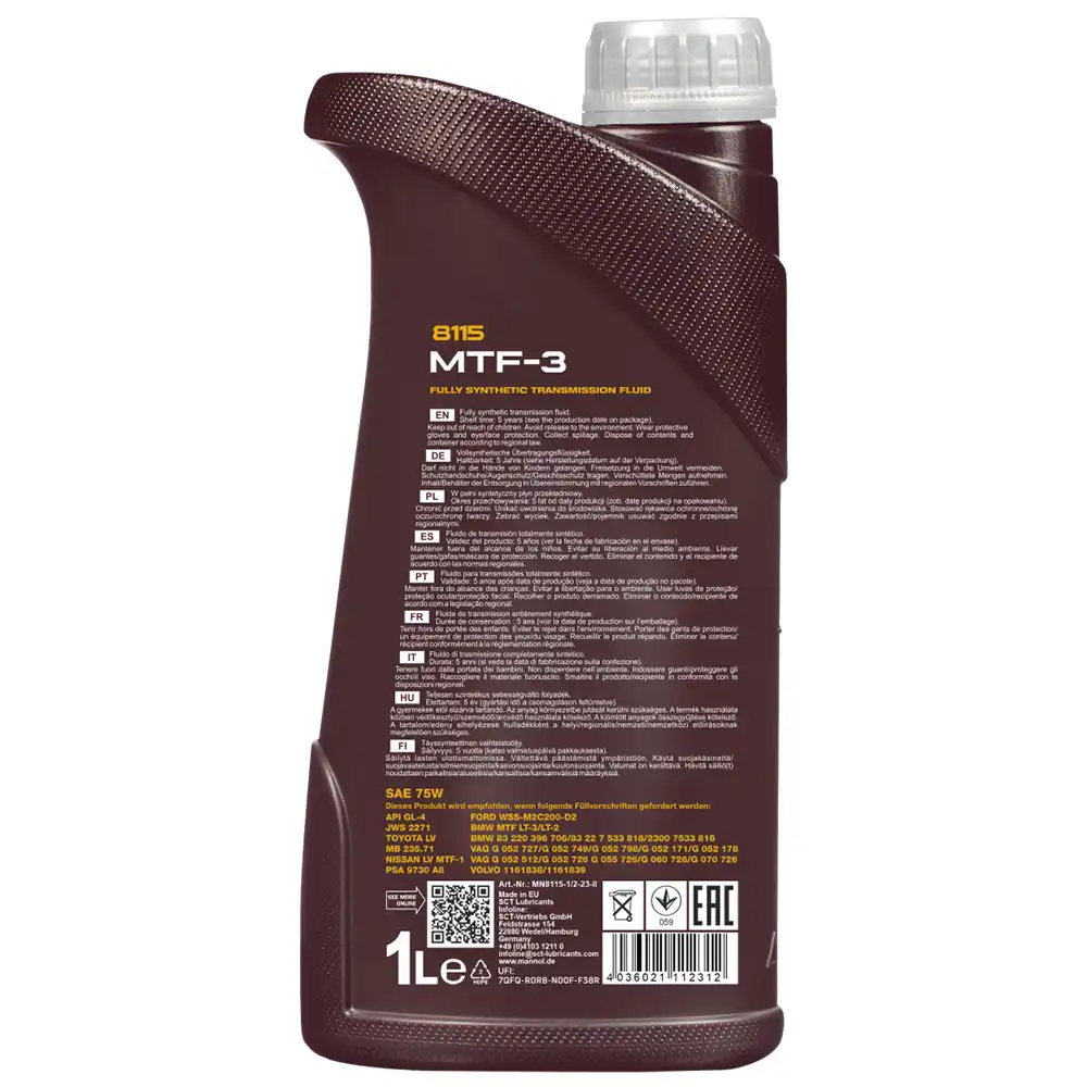روغن گیربکس مانول MTF-3 75W 8115 حجم 1 لیتر از محصولات تمام سنتتیک، تخصصی و باکیفیت شرکت Mannol آلمان است که برای افزایش کارایی و دوام گیربکسهای دستی طراحی شده است. این روغن با بهرهگیری از فرمولاسیون سنتتیک پیشرفته و افزودنیهای نسل جدید، روانکاری مطمئن را در شرایط مختلف دمایی تضمین میکند و عملکردی پایدار در رانندگی شهری و جادهای ارائه میدهد. درواقع روغن گیربکس مانول 75W 8115 یک محصول پیشرفته و چندمنظوره است که بهطور ویژه برای استفاده در گیربکسهای دستی و روباتیک خودروهای TOYOTA و FORD طراحی و توسعه یافته است (توجه: برای همه گیربکسهای دستی مناسب نیست).