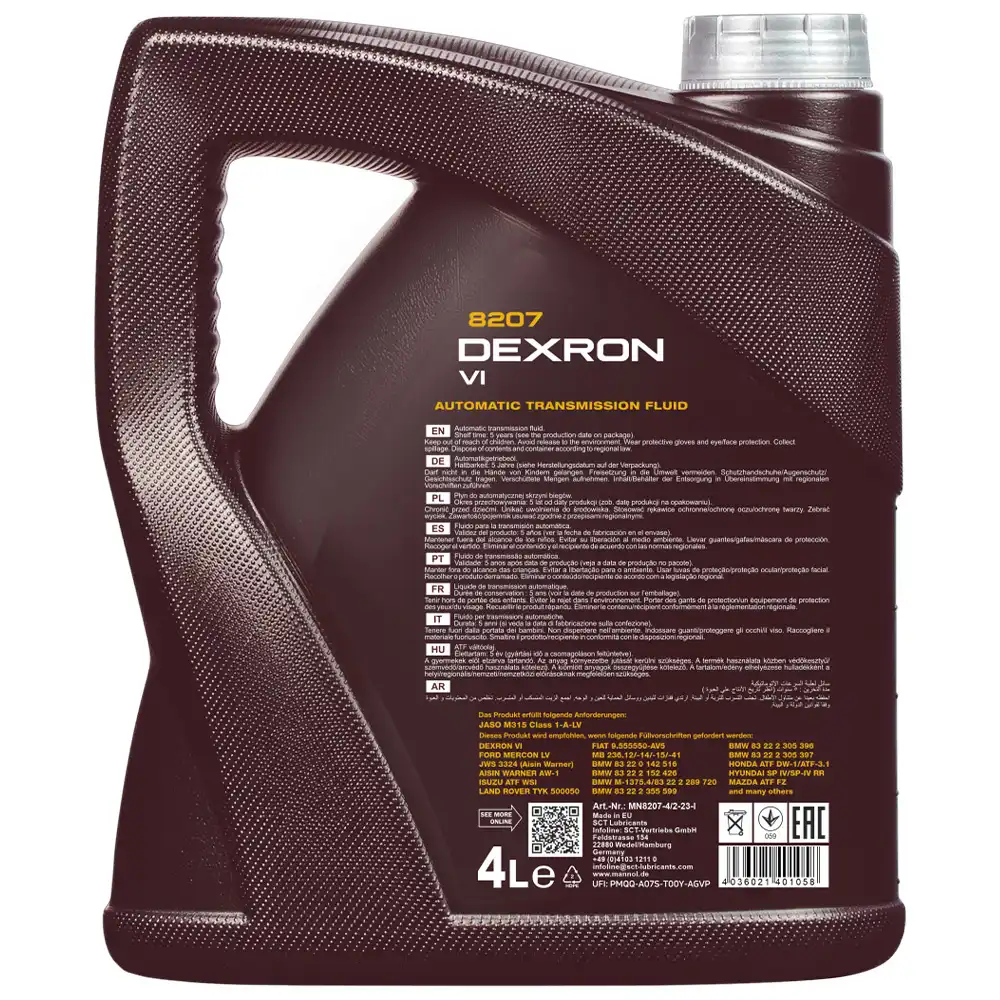 MANNOL 8207 ATF Dexron VI حجم 4 لیتر ساخت برند مانول آلمان، یک محصول پیشرفته با فرمولاسیون فول سنتتیک fully synthetic است که به طور خاص برای نسل جدید گیربکسهای اتوماتیک طراحی شده است. این روغن با انطباق کامل با استاندارد GM Dexron VI 8207، روانکاری ایدهآل و محافظت چندلایه از قطعات داخلی گیربکس را فراهم میآورد. فرمولاسیون MANNOL 8207 ATF Dexron VI بر پایه فناوری پیشرفته افزودنیهای ضدسایش، پاککنندههای قوی و مواد ضد اکسیداسیون است و تضمین میکند که در برابر فشارهای بالا، حرارت زیاد و شرایط رانندگی سنگین، عملکرد روغن ثابت بماند.